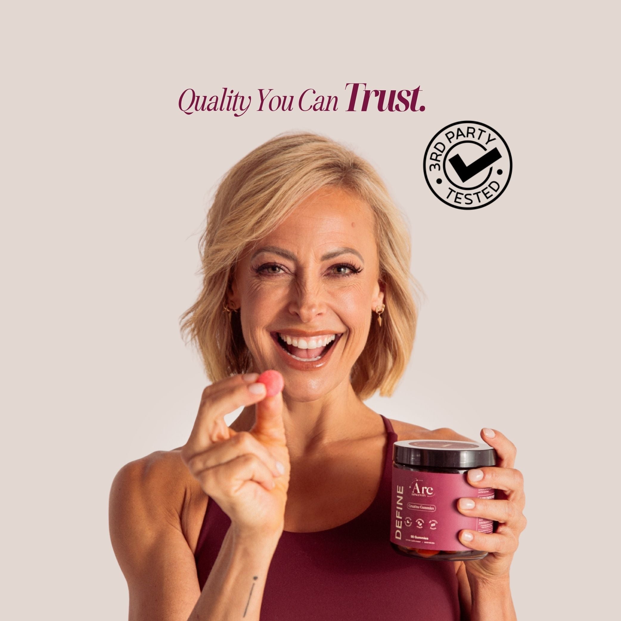 Creatine and midlife equals smart strength, helps preserve lean muscle, supports brain health and mental clarity, improves power, recovery, and energy, can support bone health. And let me just say my new ARC Longevity Creatine Gummies are so good.